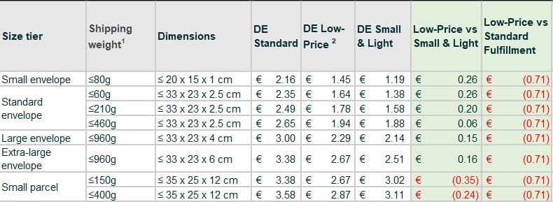 In the DE marketplace, Low-Price FBA rates provide significantly reduced fulfillment fees when compared to Standard FBA with a €0.71 savings across the board. When comparing Low Price FBA fees vs Small & Light, results are mixed with Low-Price FBA €0.18 more expensive on average in the envelope size tiers and up to €0.35 less expensive in Small Parcel.