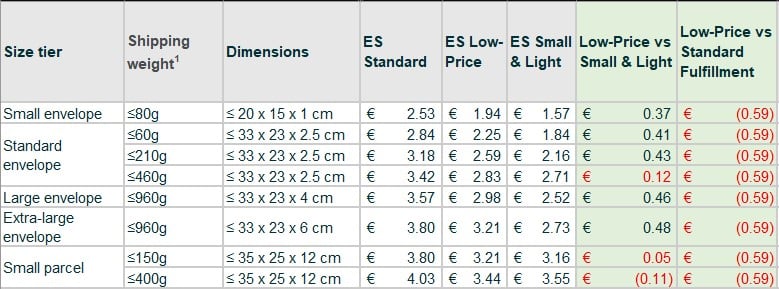 In the Spain marketplace, Low-Price FBA rates provide significantly reduced fulfillment fees when compared to Standard FBA with a €0.59 savings across the board. When comparing Low Price FBA fees vs Small & Light, results are mixed with Low-Price FBA €0.38 more expensive on average in the envelope size tiers and up to €0.11 less expensive in Small Parcel.