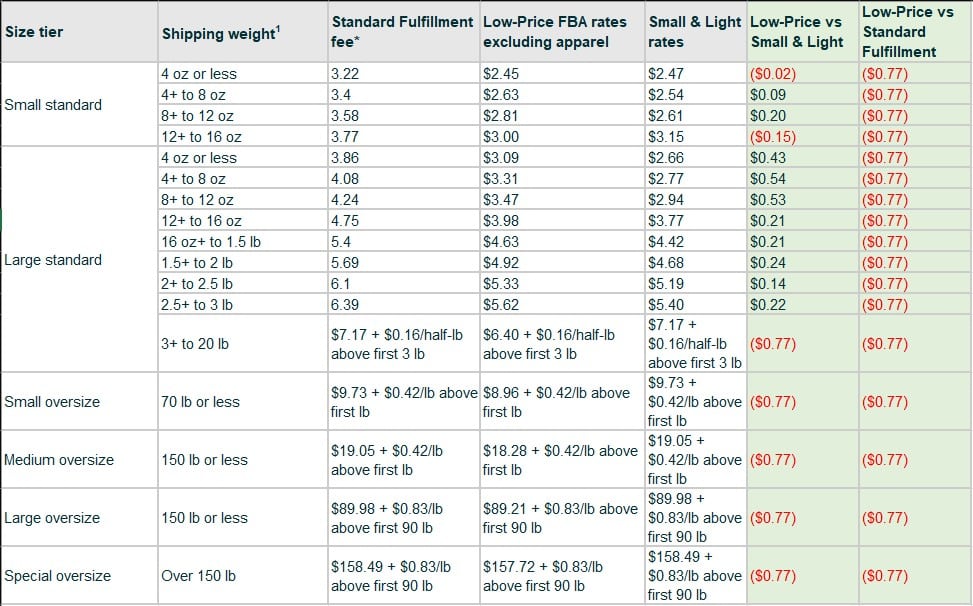 For example, according to Amazon's fee chart comparison below, Low-Price FBA rates have significantly reduced fulfillment fees when compared to Standard FBA with a $0.77 savings across the board