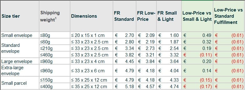 In the France marketplace, Low-Price FBA rates provide significantly reduced fulfillment fees when compared to Standard FBA with a €0.61 savings across the board. When comparing Low Price FBA fees vs Small & Light, results are mixed with Low-Price FBA €0.21 more expensive on average in the envelope size tiers and up to €0.17 less expensive in Small Parcel.