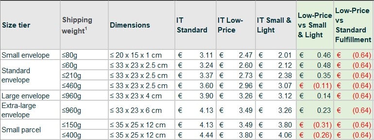 In the Italy marketplace, Low-Price FBA rates provide significantly reduced fulfillment fees when compared to Standard FBA with a €0.64 savings across the board. When comparing Low Price FBA fees vs Small & Light, results are mixed with Low-Price FBA €0.26 more expensive on average in the envelope size tiers and up to €0.31 less expensive in Small Parcel.