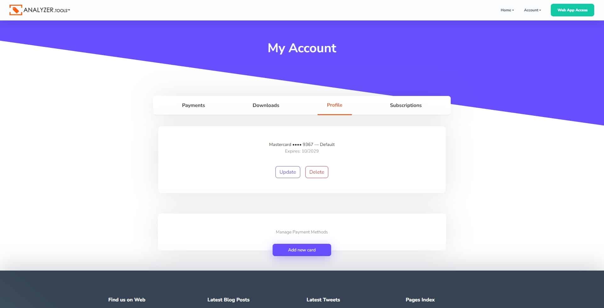 You can update your payment method by logging into the My Account section of www.Analyzer.Tools . Once in My Account, scroll to the bottom of the Profile tab to manage your payment method.