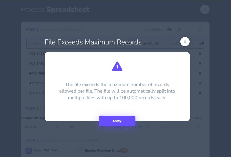 The app can now accept huge spreadsheets of up to 1,000,000 products per spreadsheet or a maximum file size of 200mb/file. Since showing so much data in a browser window is likely to cause computers to explode (it’s a joke), we automatically split the results into ~100,000 product chunks.